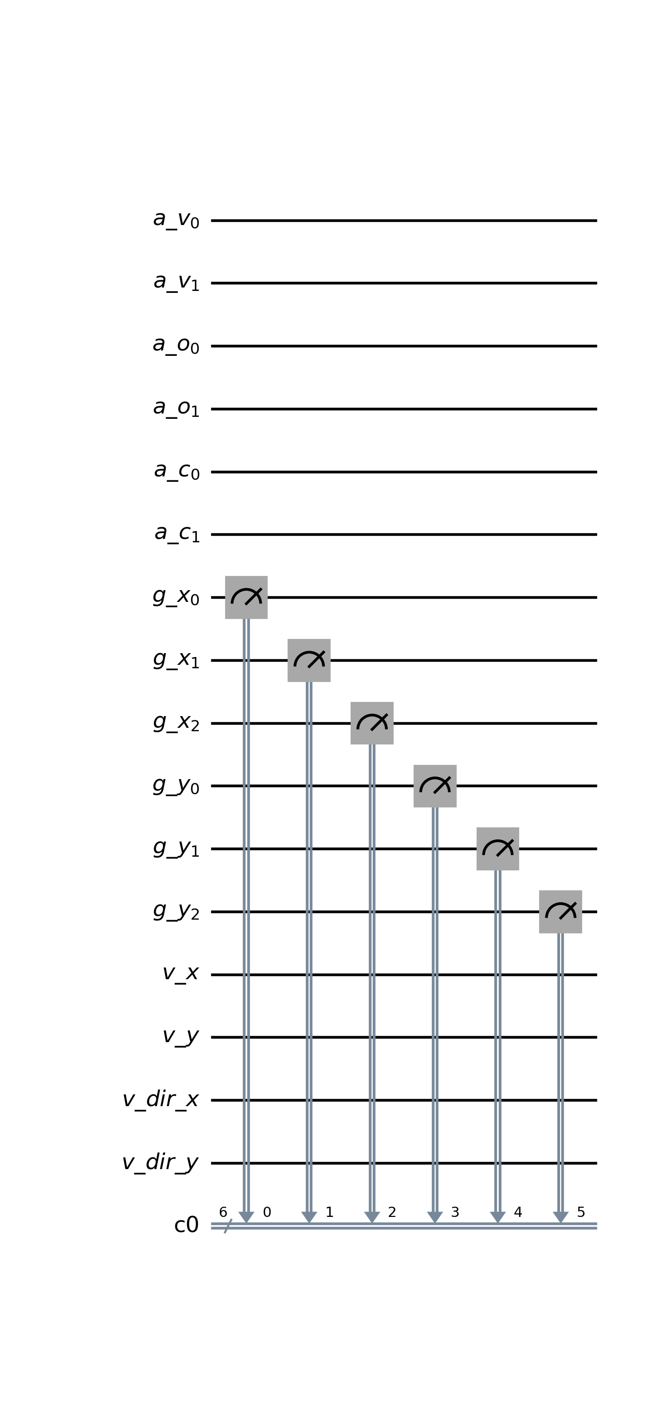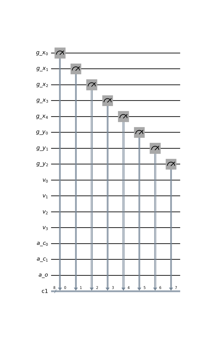 from qlbm.components.ms import GridMeasurement from qlbm.lattice import MSLattice # Build an example lattice lattice = MSLattice({ "lattice": { "dim": { "x": 8, "y": 8 }, "velocities": { "x": 4, "y": 4 } }, "geometry": [ { "shape": "cuboid", "x": [5, 6], "y": [1, 2], "boundary": "specular" } ] }) # Draw the measurement circuit GridMeasurement(lattice).draw("mpl")
