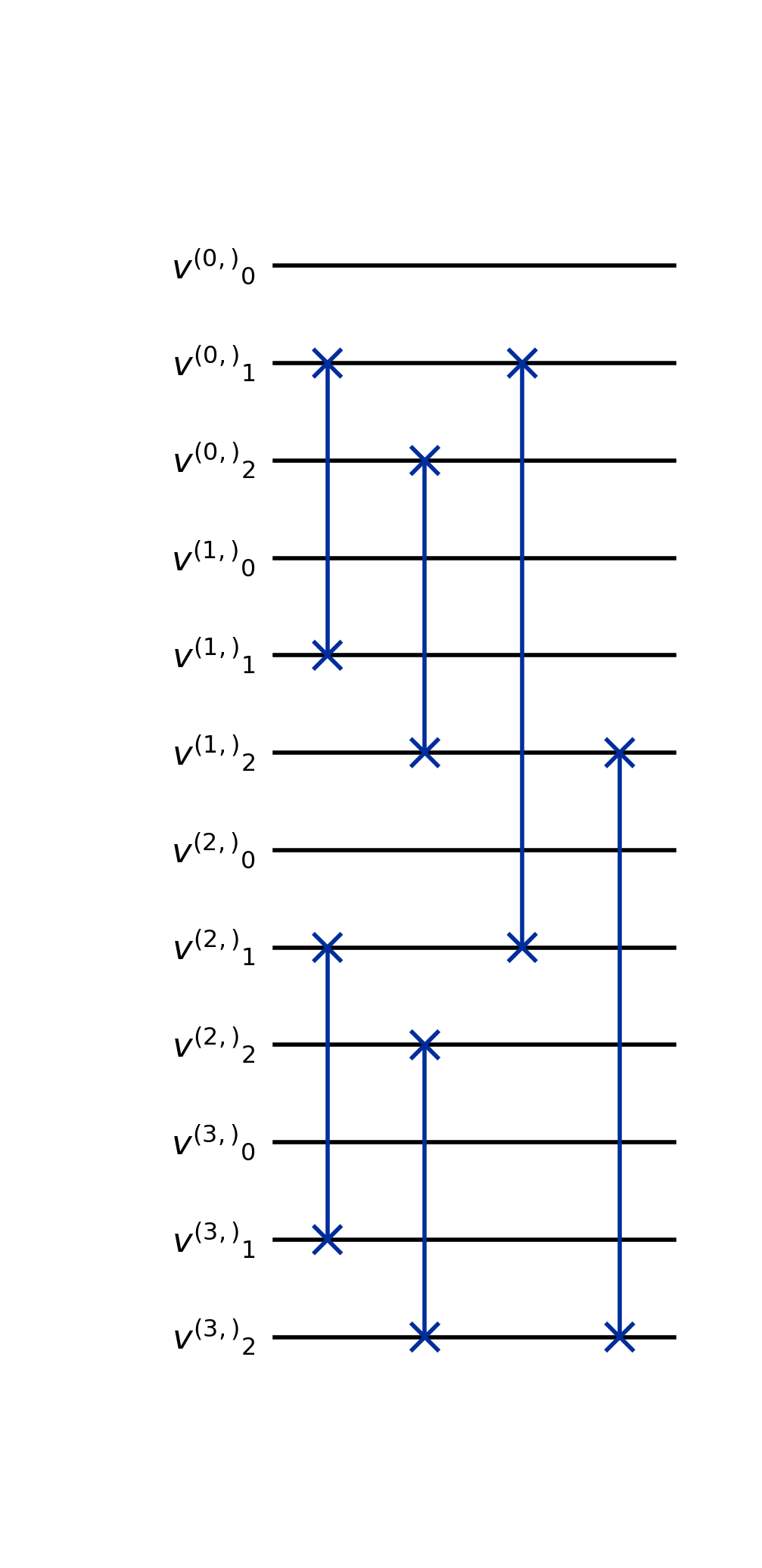 from qlbm.components.spacetime.initial import PointWiseSpaceTimeInitialConditions from qlbm.lattice import SpaceTimeLattice # Build an example lattice lattice = SpaceTimeLattice( num_timesteps=1, lattice_data={ "lattice": {"dim": {"x": 4, "y": 8}, "velocities": "D2Q4"}, "geometry": [], }, ) # Draw the initial conditions for two particles at (3, 7), traveling in the +y and -y directions PointWiseSpaceTimeInitialConditions(lattice=lattice, grid_data=[((3, 7), (False, True, False, True))]).draw("mpl")